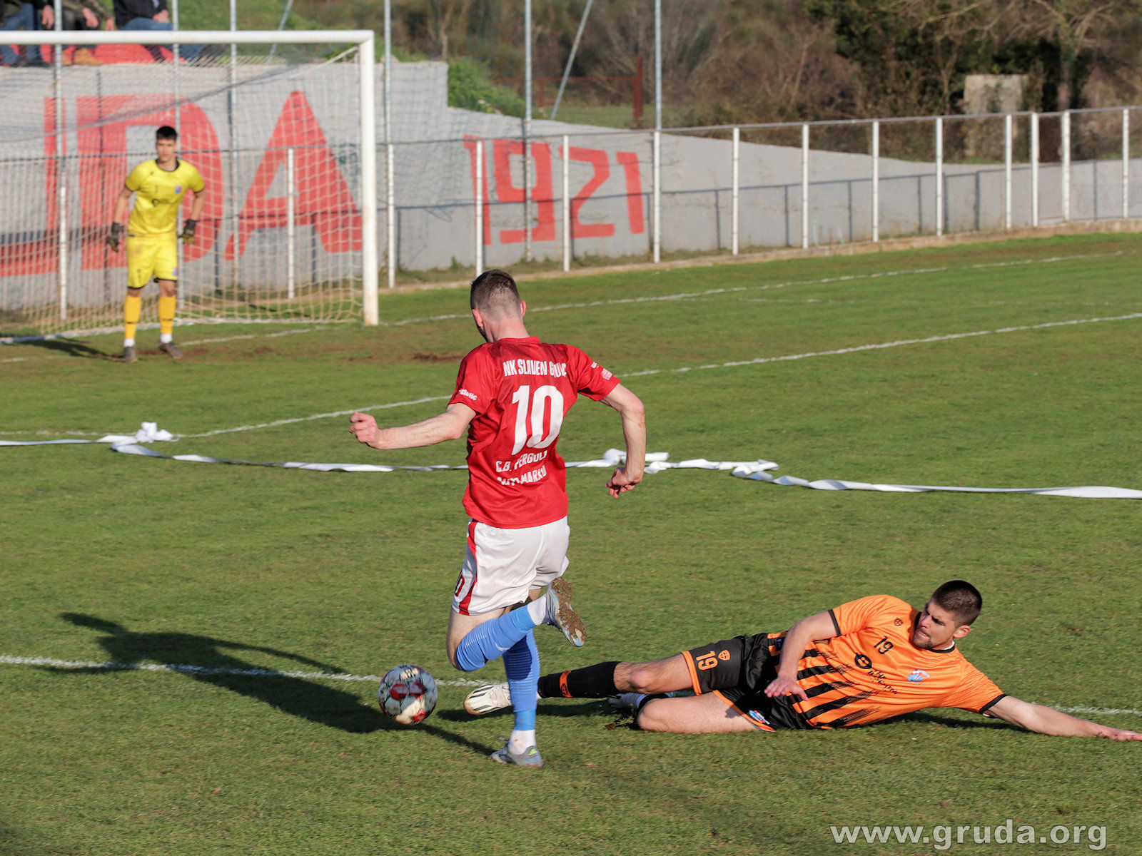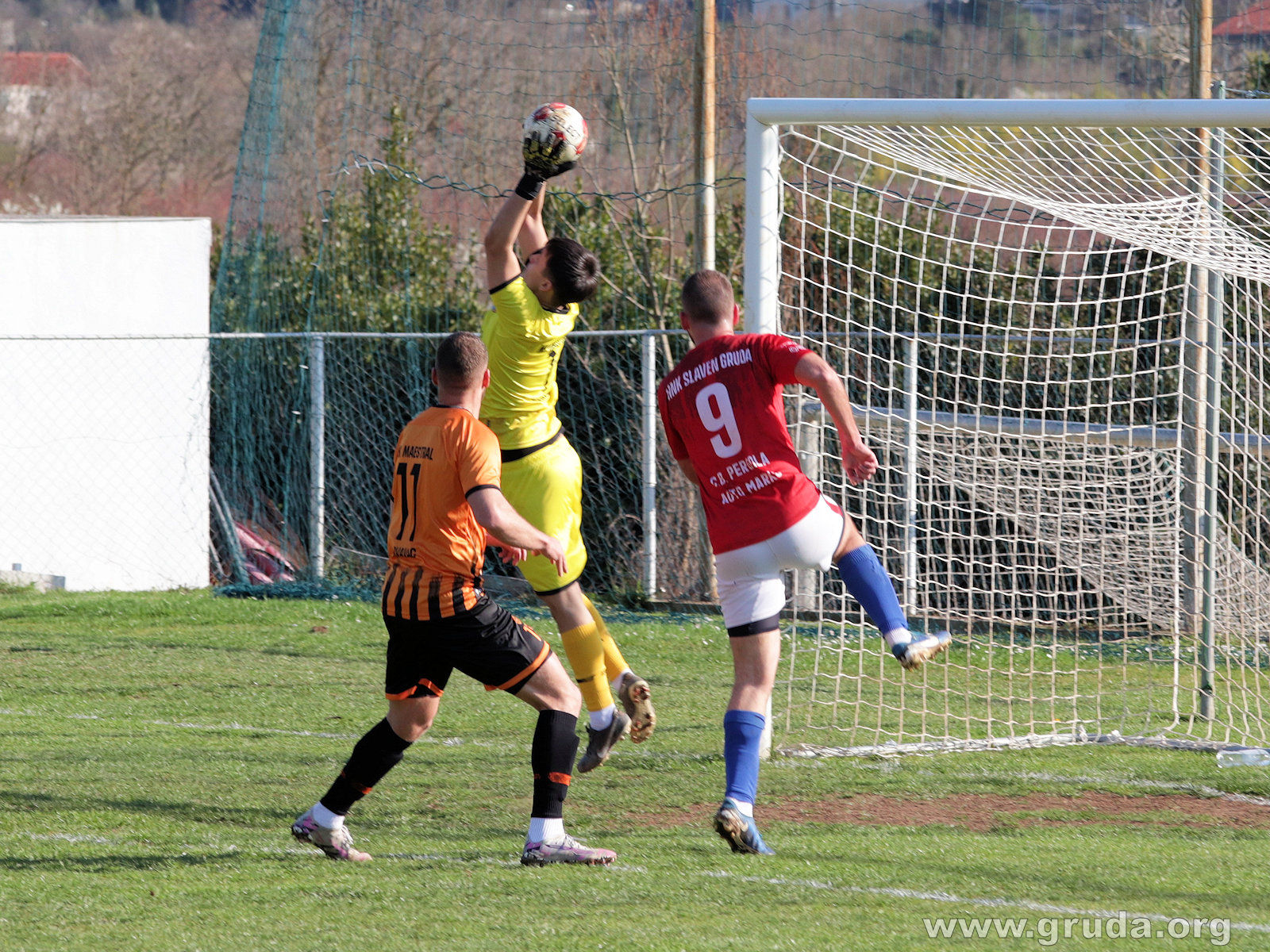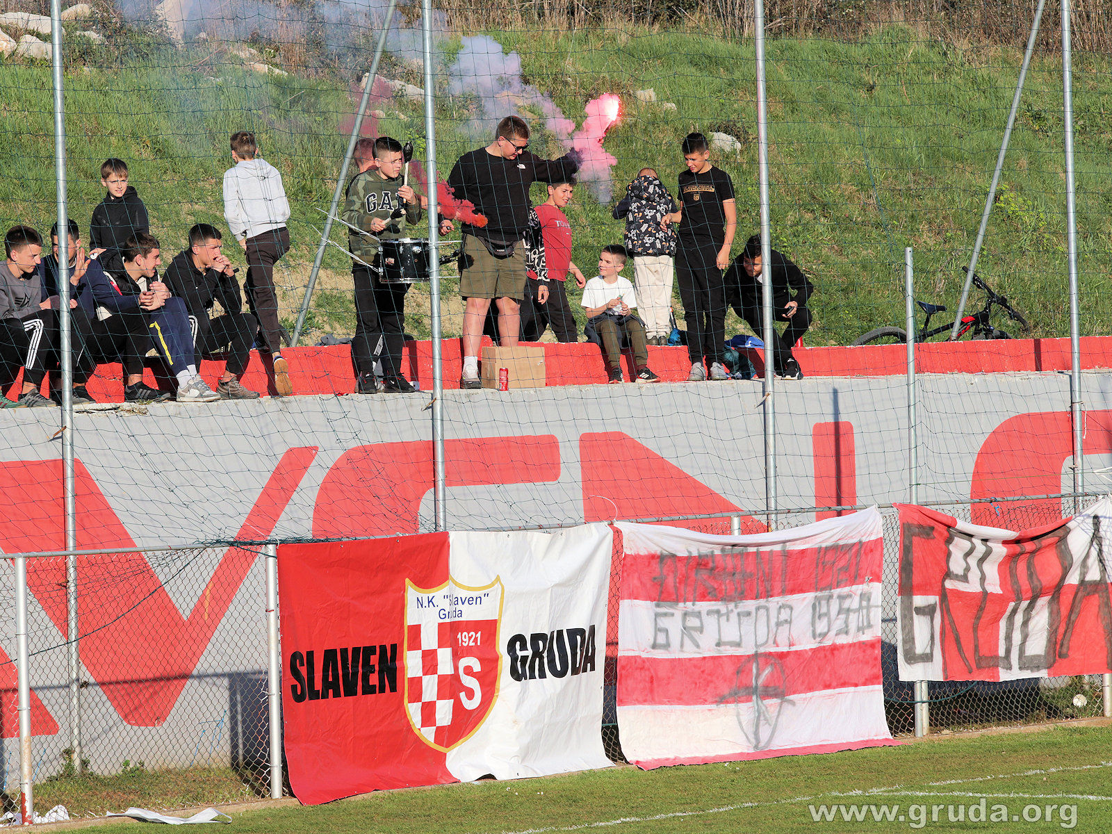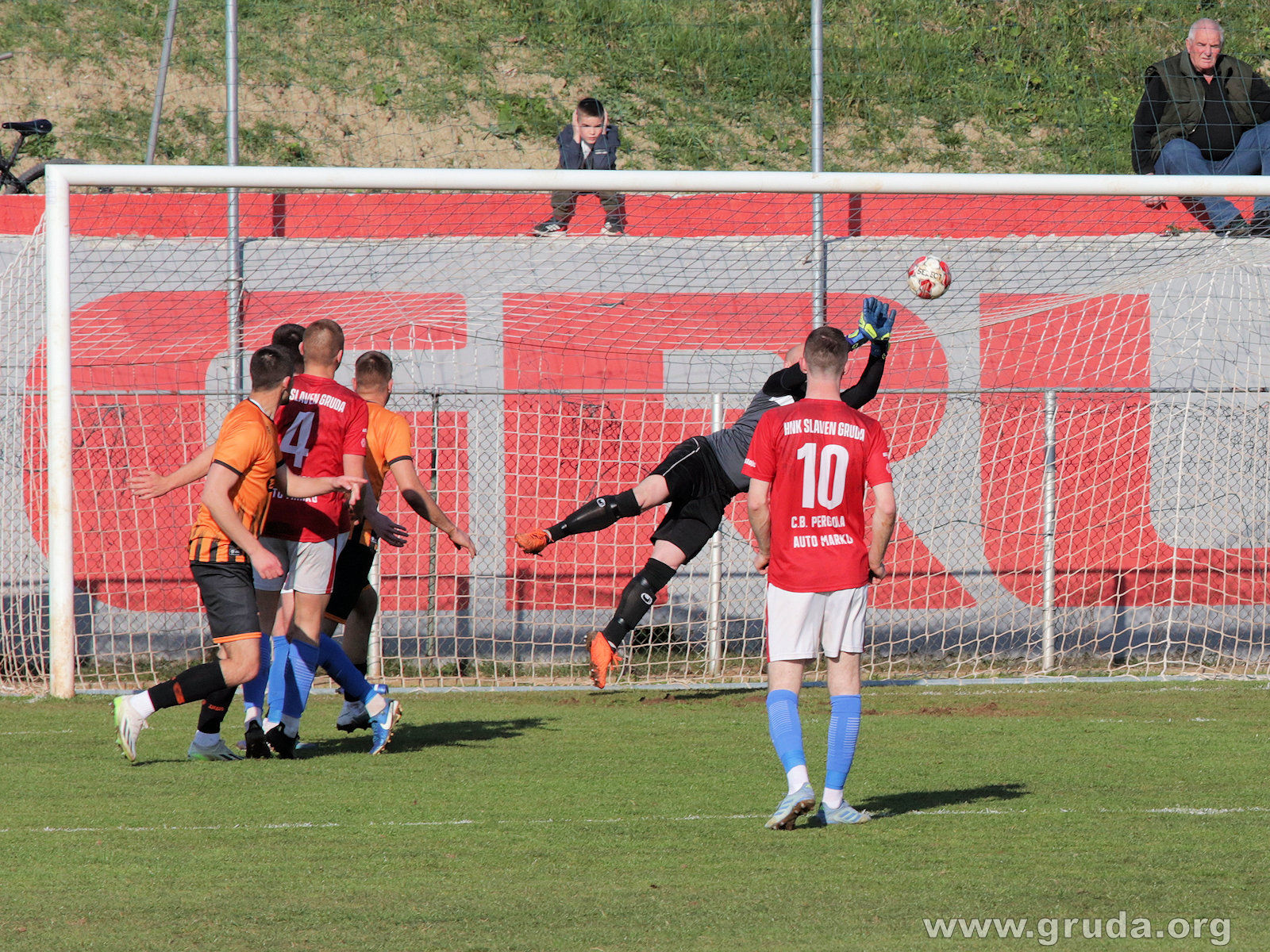 Po lijepom sunčanom vremenu na Gnjilama se okupio veliki broj navijača grudskih crvenih, a tu su danas kao posebni gosti bila i djeca iz doma Maslina. A za njihovu dobru zabavu pobrinuli su se domaći igrači. Presing otpočetka je brzo urodio plodom, već u 11. minuti Ivo Mostahinić je zabio glavom za 1:0. Onda je slijedila prilika Gojka Koraća, ali je golman nogom uspio obraniti njegov udarac. Ipak, samo koji minut kasnije nakon nabačaja s lijeve strane, lopta je preletjela sve i na drugoj stativi je dočekao Dominik Zglav, smirio je i zabio za 2:0. Nakon odlične dubinske lopte, Paulo Vukić se našao u prilici da ide sam prema golu domaćina, ali ga je branič Luka Herceg zaustavio, i za to je dobio crveni karton, pa je Slaven od 32. minute imao igrača više. A upravo iz tog slobodnog udarca svoj prvijenac je postogao Igor Musa, savršeno odmjerenim udarcem. Gosti su ipak uspjeli stvoriti jednu priliku, i to jako dobru, ali je Luka Zec odlično obranio udarac glavom.