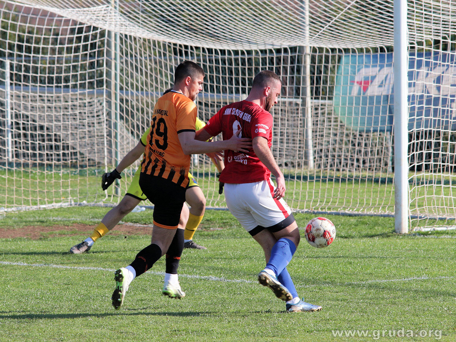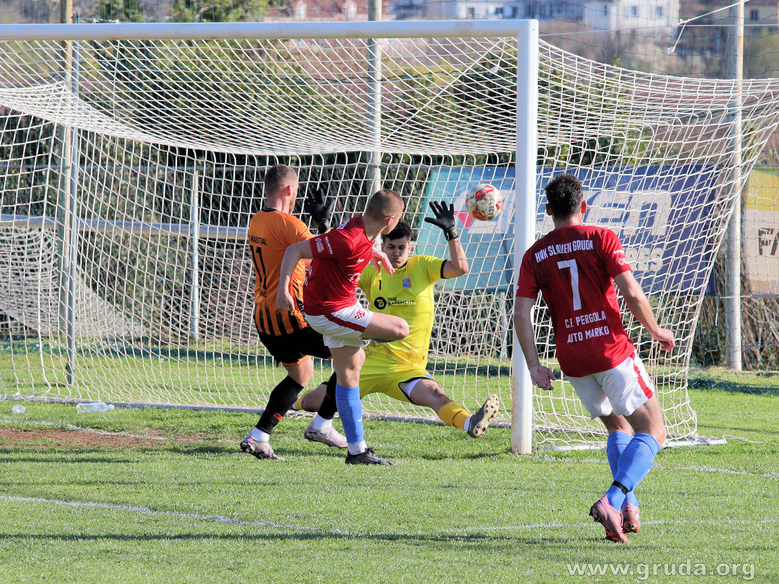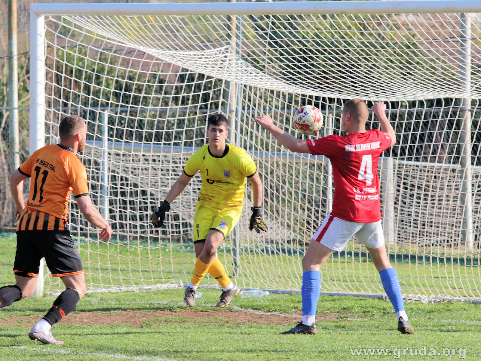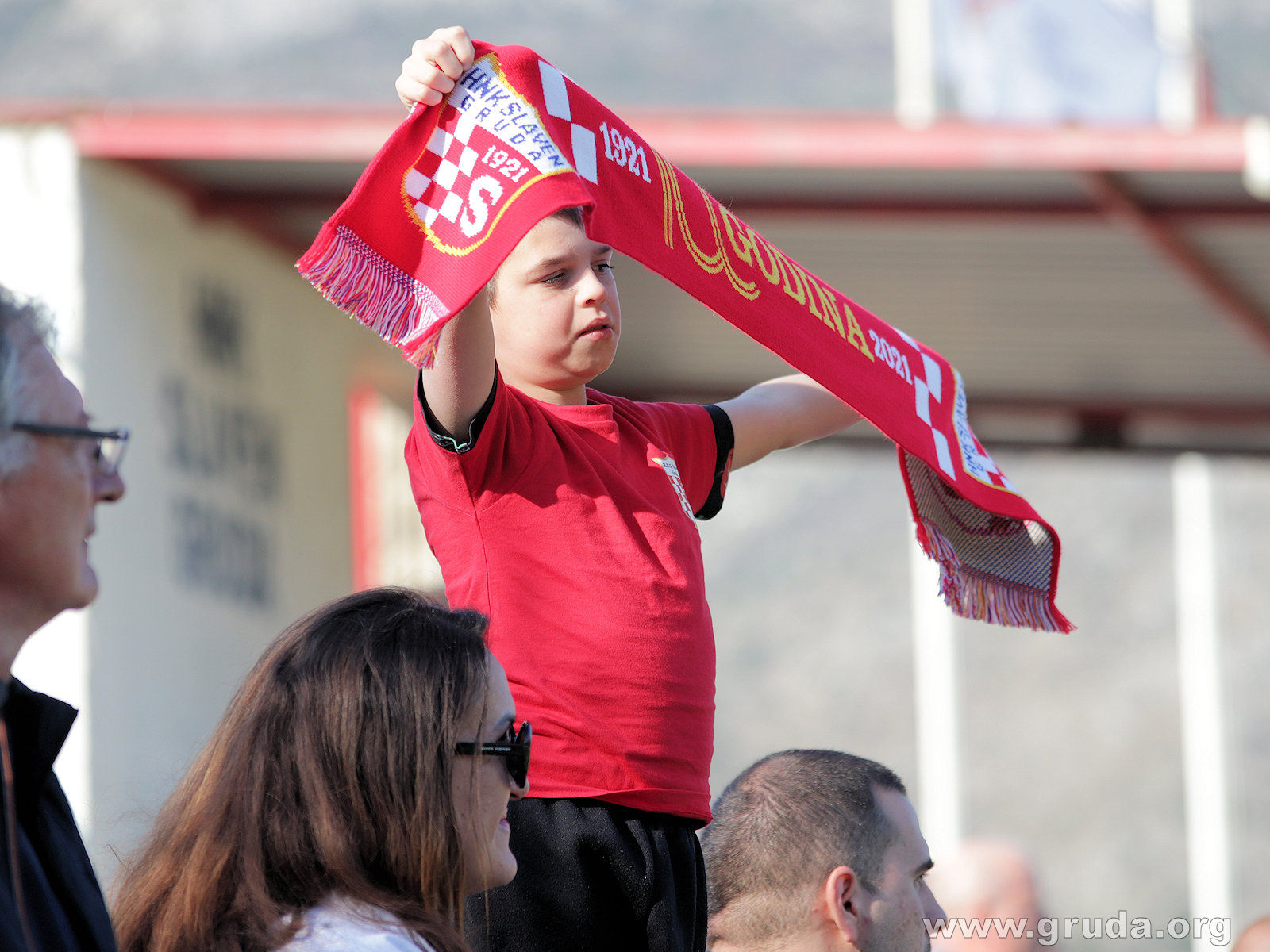 Po lijepom sunčanom vremenu na Gnjilama se okupio veliki broj navijača grudskih crvenih, a tu su danas kao posebni gosti bila i djeca iz doma Maslina. A za njihovu dobru zabavu pobrinuli su se domaći igrači. Presing otpočetka je brzo urodio plodom, već u 11. minuti Ivo Mostahinić je zabio glavom za 1:0. Onda je slijedila prilika Gojka Koraća, ali je golman nogom uspio obraniti njegov udarac. Ipak, samo koji minut kasnije nakon nabačaja s lijeve strane, lopta je preletjela sve i na drugoj stativi je dočekao Dominik Zglav, smirio je i zabio za 2:0. Nakon odlične dubinske lopte, Paulo Vukić se našao u prilici da ide sam prema golu domaćina, ali ga je branič Luka Herceg zaustavio, i za to je dobio crveni karton, pa je Slaven od 32. minute imao igrača više. A upravo iz tog slobodnog udarca svoj prvijenac je postogao Igor Musa, savršeno odmjerenim udarcem. Gosti su ipak uspjeli stvoriti jednu priliku, i to jako dobru, ali je Luka Zec odlično obranio udarac glavom.