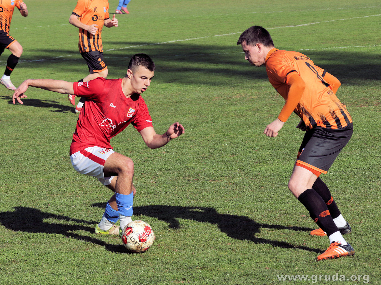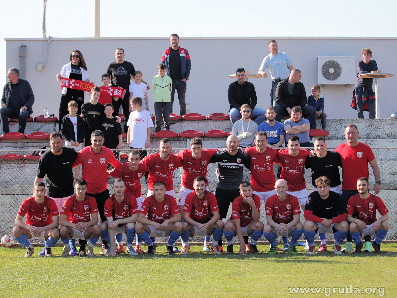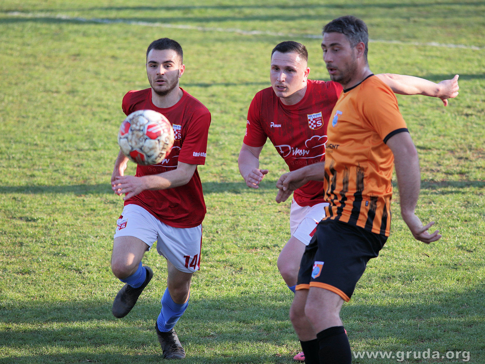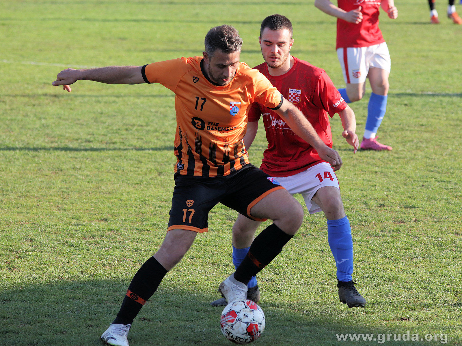 Po lijepom sunčanom vremenu na Gnjilama se okupio veliki broj navijača grudskih crvenih, a tu su danas kao posebni gosti bila i djeca iz doma Maslina. A za njihovu dobru zabavu pobrinuli su se domaći igrači. Presing otpočetka je brzo urodio plodom, već u 11. minuti Ivo Mostahinić je zabio glavom za 1:0. Onda je slijedila prilika Gojka Koraća, ali je golman nogom uspio obraniti njegov udarac. Ipak, samo koji minut kasnije nakon nabačaja s lijeve strane, lopta je preletjela sve i na drugoj stativi je dočekao Dominik Zglav, smirio je i zabio za 2:0. Nakon odlične dubinske lopte, Paulo Vukić se našao u prilici da ide sam prema golu domaćina, ali ga je branič Luka Herceg zaustavio, i za to je dobio crveni karton, pa je Slaven od 32. minute imao igrača više. A upravo iz tog slobodnog udarca svoj prvijenac je postogao Igor Musa, savršeno odmjerenim udarcem. Gosti su ipak uspjeli stvoriti jednu priliku, i to jako dobru, ali je Luka Zec odlično obranio udarac glavom.