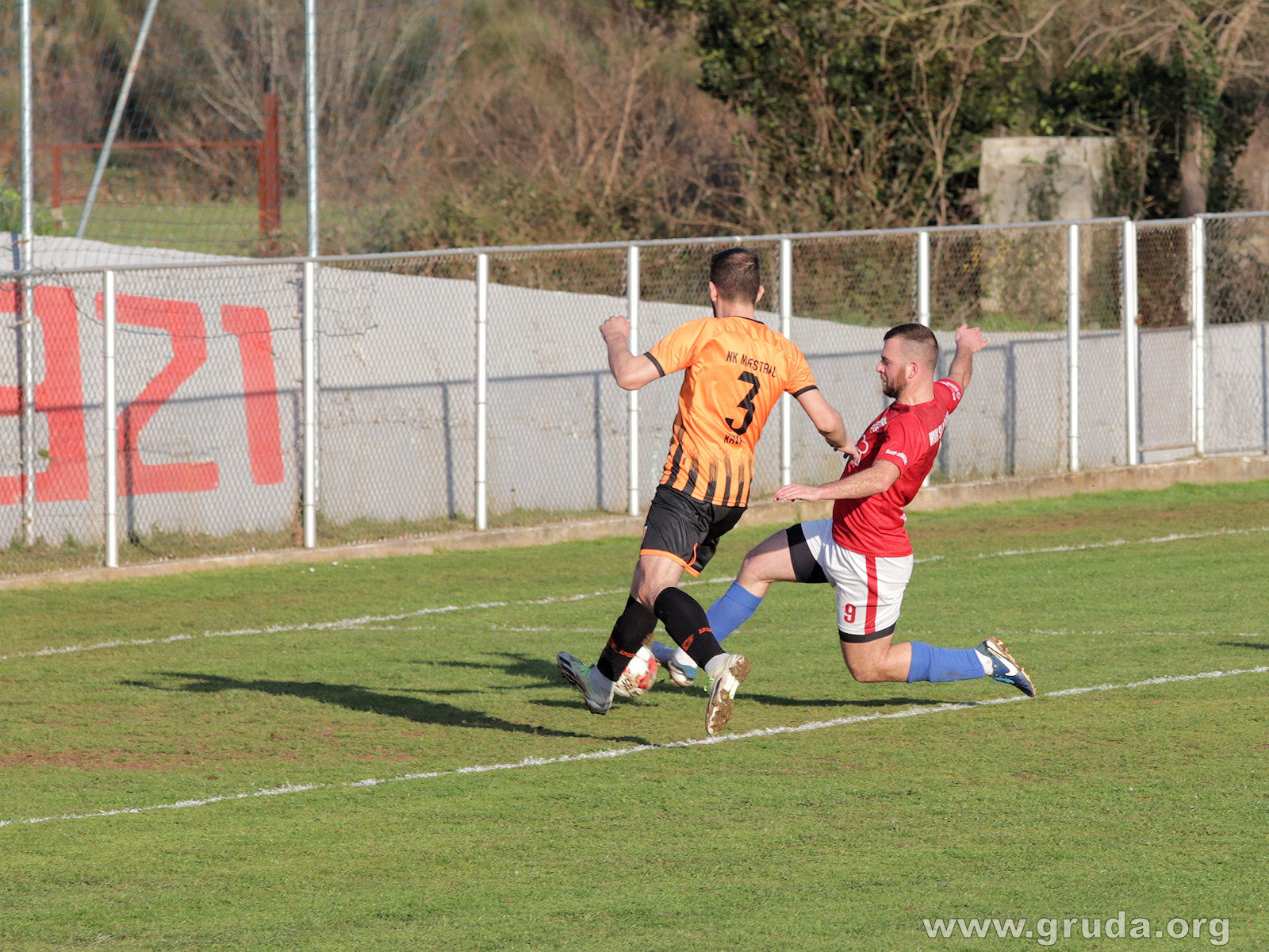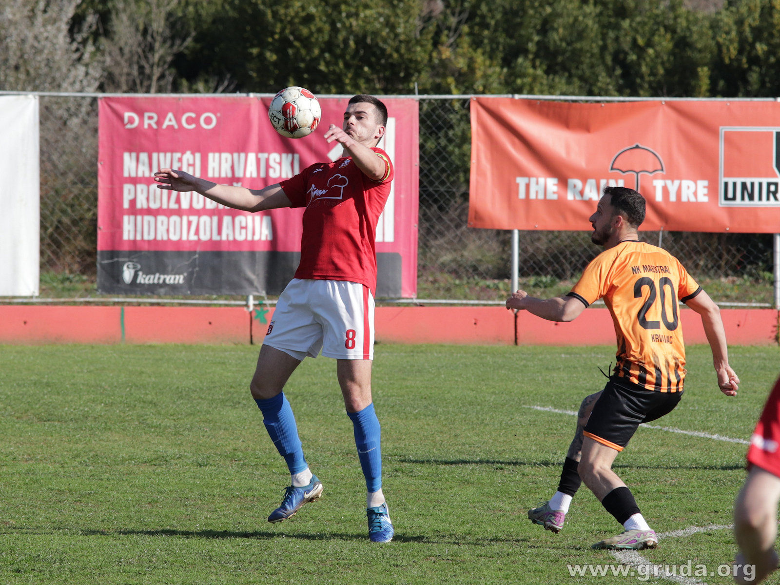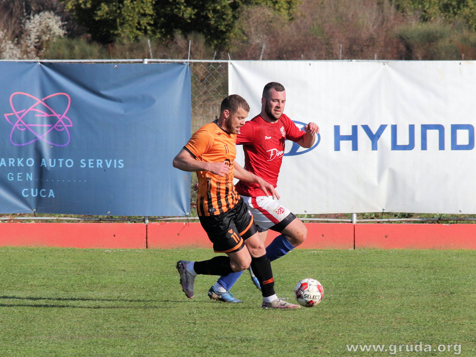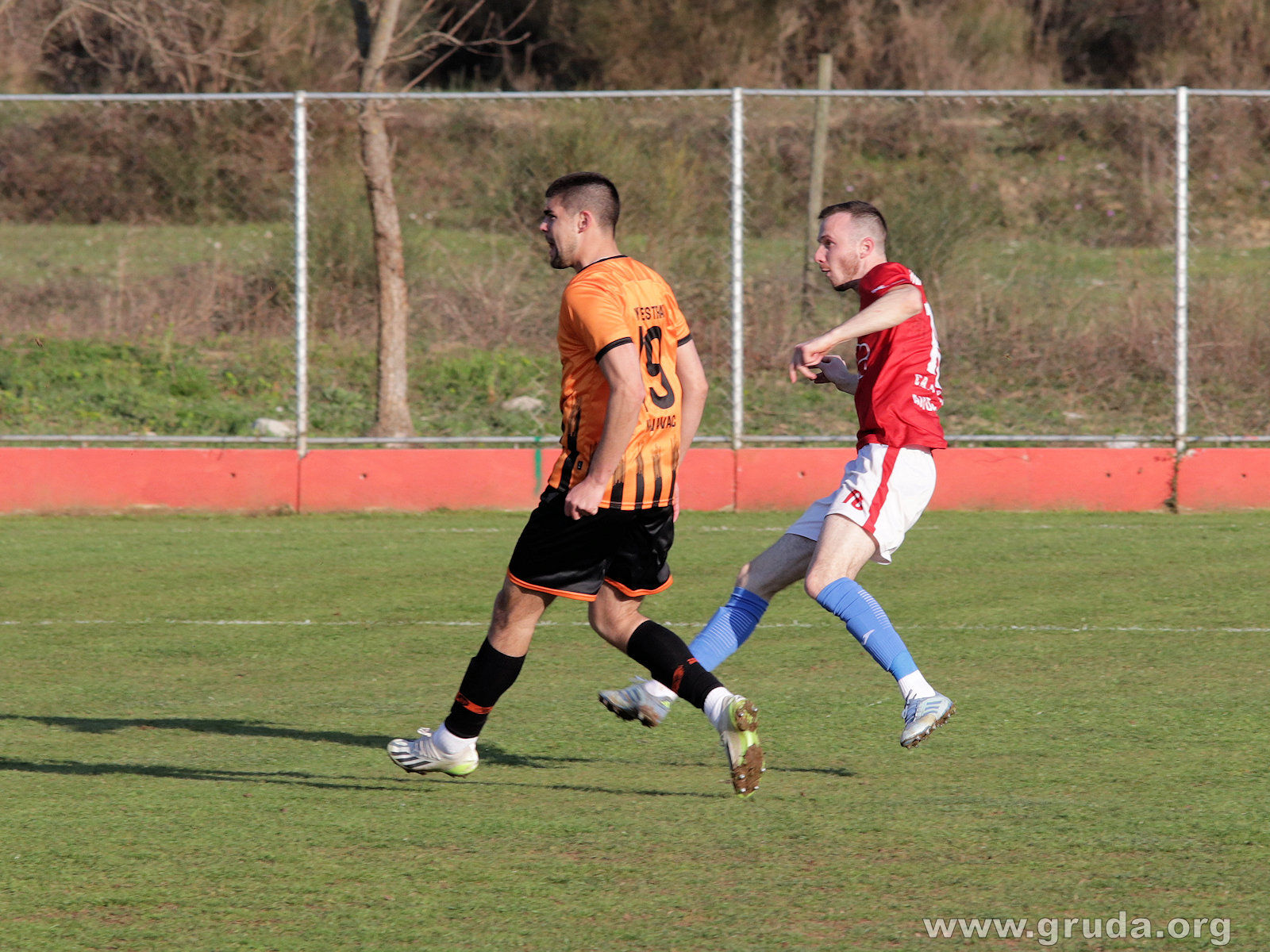 Po lijepom sunčanom vremenu na Gnjilama se okupio veliki broj navijača grudskih crvenih, a tu su danas kao posebni gosti bila i djeca iz doma Maslina. A za njihovu dobru zabavu pobrinuli su se domaći igrači. Presing otpočetka je brzo urodio plodom, već u 11. minuti Ivo Mostahinić je zabio glavom za 1:0. Onda je slijedila prilika Gojka Koraća, ali je golman nogom uspio obraniti njegov udarac. Ipak, samo koji minut kasnije nakon nabačaja s lijeve strane, lopta je preletjela sve i na drugoj stativi je dočekao Dominik Zglav, smirio je i zabio za 2:0. Nakon odlične dubinske lopte, Paulo Vukić se našao u prilici da ide sam prema golu domaćina, ali ga je branič Luka Herceg zaustavio, i za to je dobio crveni karton, pa je Slaven od 32. minute imao igrača više. A upravo iz tog slobodnog udarca svoj prvijenac je postogao Igor Musa, savršeno odmjerenim udarcem. Gosti su ipak uspjeli stvoriti jednu priliku, i to jako dobru, ali je Luka Zec odlično obranio udarac glavom.