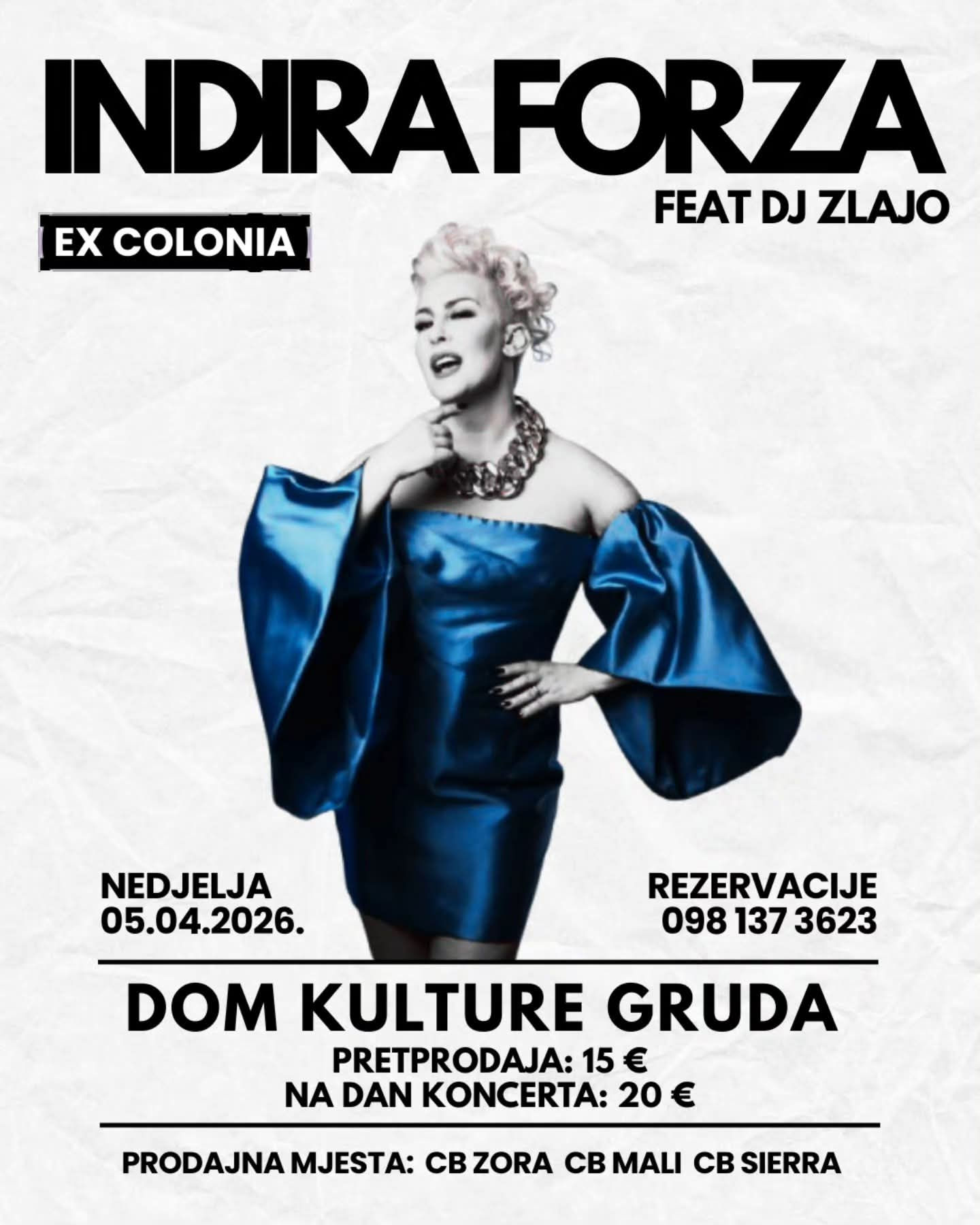 Jedna od najenergičnijih pjevačica s hrvatske estrade, Indira Forza (nekad pjevala u bendu Colonia), stiže na Grudu. U neđeju, 05. travnja 2026., Dom kulture Gruda postat će centar najboje zabave u županiji (i šire).